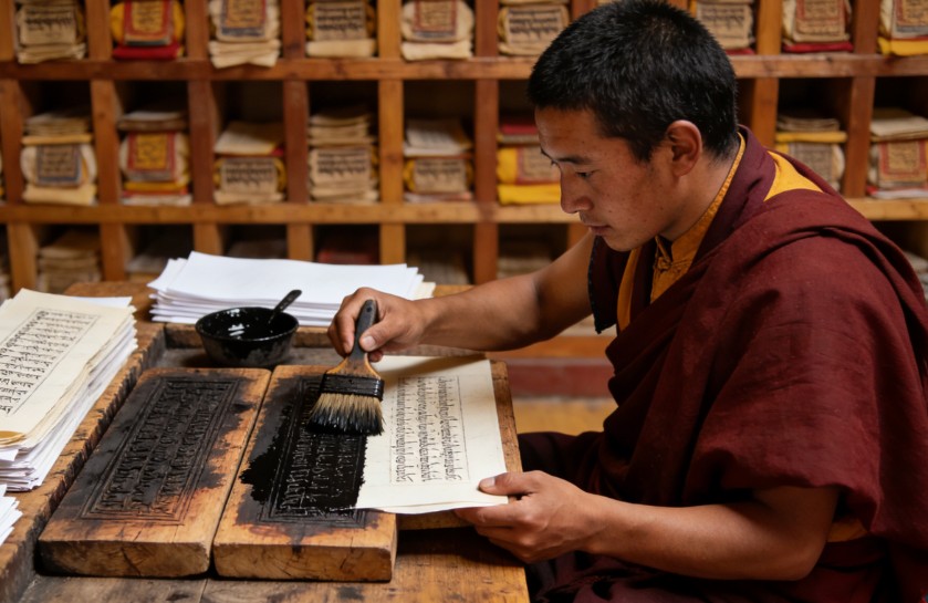 印经院的核心在于“印经”这一传统工艺,这一过程并非简单的复制,而是一场对文化的敬畏与守护。印刷所用的纸张为特制的藏纸,以当地瑞香狼毒草为原料,具有防虫、防蛀、耐折、耐晒的特性,能让典籍长久保存。印刷时,工匠们需先将经版擦拭干净,再用特制的墨汁均匀涂刷,随后覆盖藏纸,轻压揭起,一幅清晰的经文便呈现在纸上。整个过程全靠手工完成,耗时费力,却保证了经文的准确与完整。如今,这项传统工艺仍在印经院延续,工匠们以专注的态度守护着这一文化火种,让古老的智慧得以代代相传。