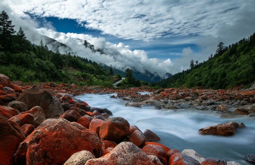 此外,海螺沟还是名副其实的“天然氧吧”,茂密的原始森林释放出大量负氧离子,植被覆盖率很高,汇聚了珙桐、麦吊杉等多种珍稀植物,也是牛羚、大熊猫等珍稀动物的栖息地,被称为“第四季冰川时期动植物的避难所”。景区内的红石滩更是自然造化的奇迹,每一块石头都被原始藻类覆盖,披上了绛红色的外衣,与清冽的流水相伴,构成了一幅奇异的自然画卷。走进海螺沟,既能领略冰川的壮阔、温泉的温润,也能感受森林的静谧、红石的神奇,沉浸式体验贡嘎山下的自然秘境。